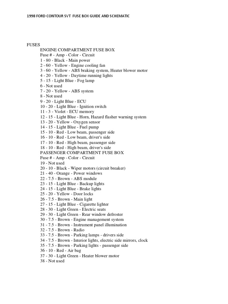 The heat works just fine in the back of the van, but the front blows only cold air. Even after a fuse is replaced, it will continue to blow if the cause of the overload is not identified and corrected. Fuse box in engine compartment. Passenger compartment fuse panel diagram. Summary of contents for ford 1998 contour.