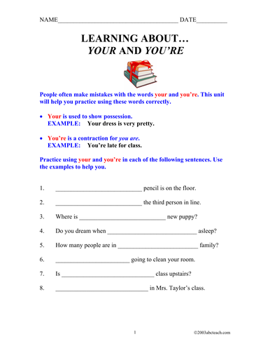 The irs says it will. Does the sight of a misspelled your make you cringe? The first part has students complete a chart by writing when to use e You're is a contraction of you are. 3 suggestions if you're missing your latest stimulus check: Your means belonging to you. Your sister is so pretty. You're is a contraction of the phrase you are. I love your long hair. Your car will get towed away. Hello, bellwork and silly lesson to follow. Send your suggestions or comments. This one page worksheet gives students practice using your and you're correctly.